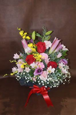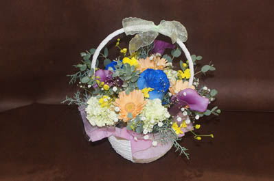 4.アレンジメント 奥行:約33cm×幅:約33cm×高さ:約32cm 花材:メイン バラ・ガーベラ・カラー その他 カーネーション・オンシジュウム 資材・ラッピング:バスケット