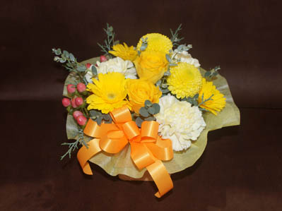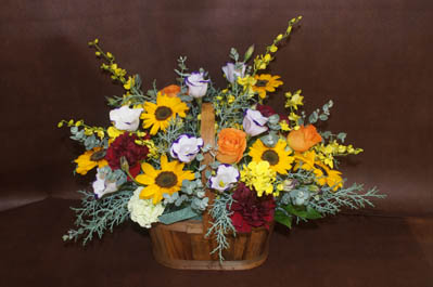 花材:メイン バラ・ひまわり その他 カーネーション・オンシジュウム ・トルコギキョウ 資材・ラッピング:バスケット