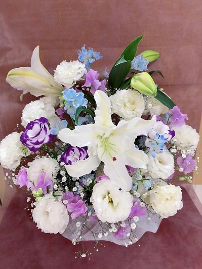 1.アレンジメント 奥行:約38cm×幅:約45cm×高さ:約53cm 花材メイン 白ユリ・白トルコキキョウ その他 スイトピー・デルフィニウム・カスミソウ 資材・ラッピング:バスケット ◆商品注意事項 仕入れ状況により、仕様が変わることがあります。