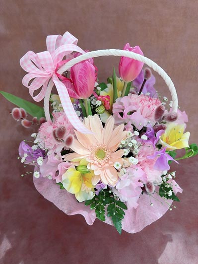 2.アレンジメント 奥行:約27cm×幅:約30cm×高さ:約28cm 花材:メイン ピンクリップ・ガーベラ・カーネーション その他 スイトピー・アルストロメリア 資材・ラッピング:バスケット