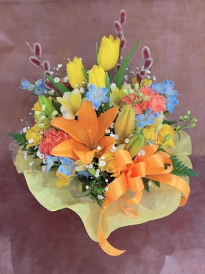 花材:メイン 黄リップ・オレンジスカシユリ その他 黄スプレーバラ・デルフィニウム・オレンジカーネ 資材・ラッピング:バスケット