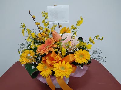 5.アレンジメント 奥行:約28cm×幅:約32cm×高さ:約30cm 花材:メイン オレンジガーベラ その他 黄バラ・ハニーエンゼル 資材・ラッピング:バスケット