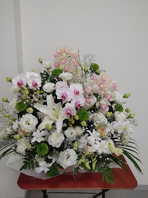 6アレンジメント 奥行:約35cm×幅:約40cm×高さ:約56cm 花材:胡蝶蘭・白ユリ その他 白トルコ・シンビジウム 資材・ラッピング:バスケット
