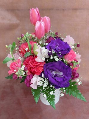 4.アレンジメント 奥行:約27cm×幅:約32cm×高さ:約34cm 花材:メイン チューリップ・トルコキキョウ・スプレーバラ その他 カーネション・スイトピー 資材・ラッピング:プラ鉢